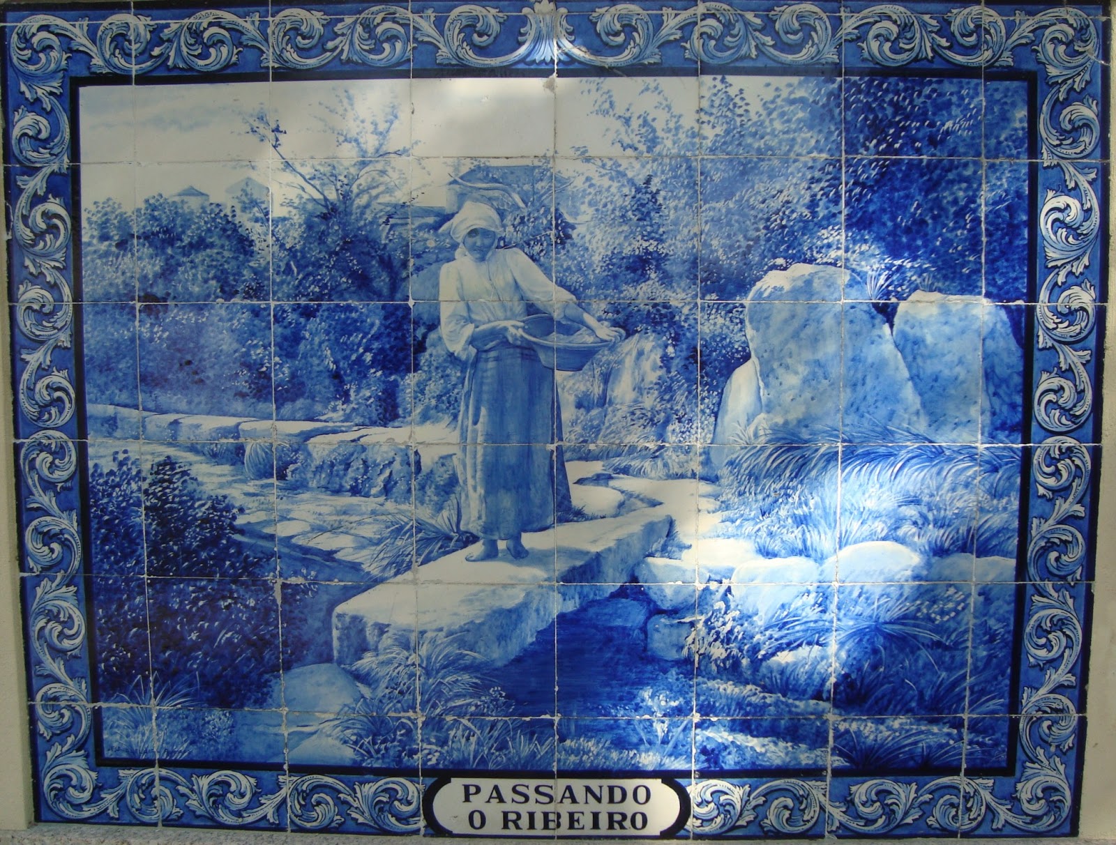 Continuando com a apresentação dos painéis de azulejo na envolvente da fachada do edifício da Vila Beatriz, em Ermesinde, e relativo à actividade rural da época dos meados do século passado, aqui se apresenta mais um painel com o título de "Passando o ribeiro".
