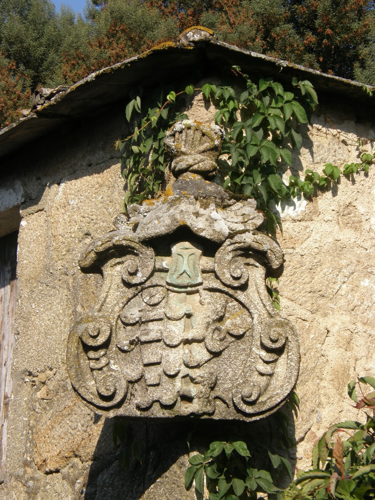 A pedra de armas em granito, de fantasia, cortada, com I - Beça e II - Barbosa, apresenta um elmo gradeado e um timbre do primeiro, de Beça, com um lobo sainte.